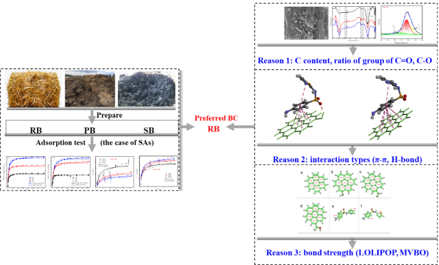 由于抗生素及其所诱导ARGs对人体的严重危害,人们采用物理、化学及生物等手段实施污染控制。其中,采用废弃物资源制备生物炭进而实施抗生素吸附去除,成本低廉受到广泛关注。活性污泥、秸秆及猪粪等常被用来制备各种用途的生物炭,然而这几种废弃物制备的生物炭吸附磺胺类抗生素有何差异?其差异的形成机制?尚不清楚。研究生范宇星等人通过等温吸附、吸附动力学、热力学等测试手段发现,秸秆制备的生物炭比猪粪及活性污泥制备的生物炭具有更好的吸附性。结构测试发现,活性污泥生物炭含碳量过低,秸秆生物炭和猪粪生物炭最大的不同在于基团C-O和C=O的含量差异。量化计算结果表明,生物炭对磺胺类抗生素的吸附主要通过π-π和氢键实现,基团C-O和C=O的含量差异导致π-π和氢键的作用强度和作用类型有显著不同。该研究成果在线发表在Journal of Hazardous Materials(https://www.sciencedirect.com/science/article/abs/pii/S0304389420322810)。